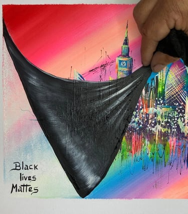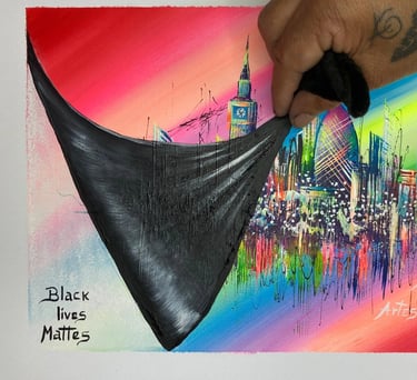With his technique Colours in Action, mixes colours thrown on canvas to create London or abstract landscapes, reflecting dynamism and unique creativity.
