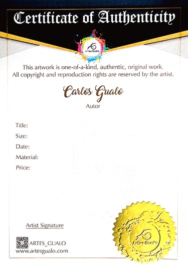 If you are interested in any of my works, each one has its own certificate of authenticity with stamp and signature that guarantees that they are unique and original, which will be delivered at the time of purchase.